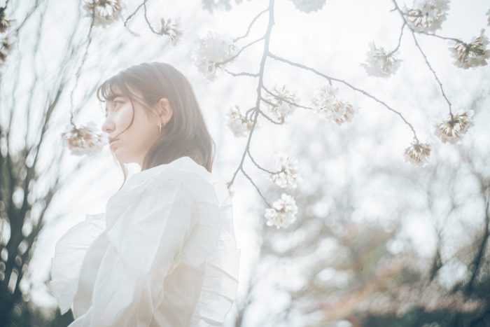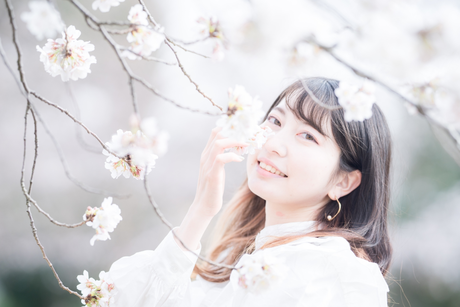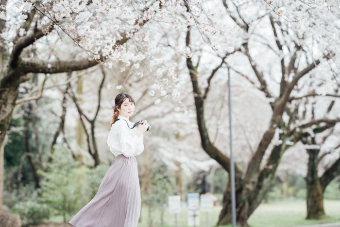 桜が満開間近の犀川沿い(いしかわ子ども交流センターあたり)で桜ポートレート